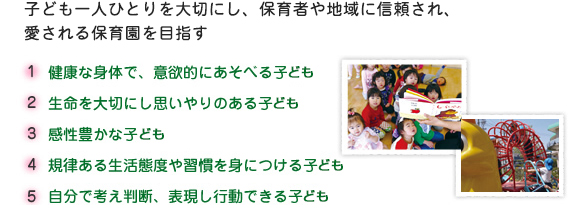 - 保育のねらいと目標を把握し、一人一人の子どもを愛情と熱意と誠意をもって保育する。