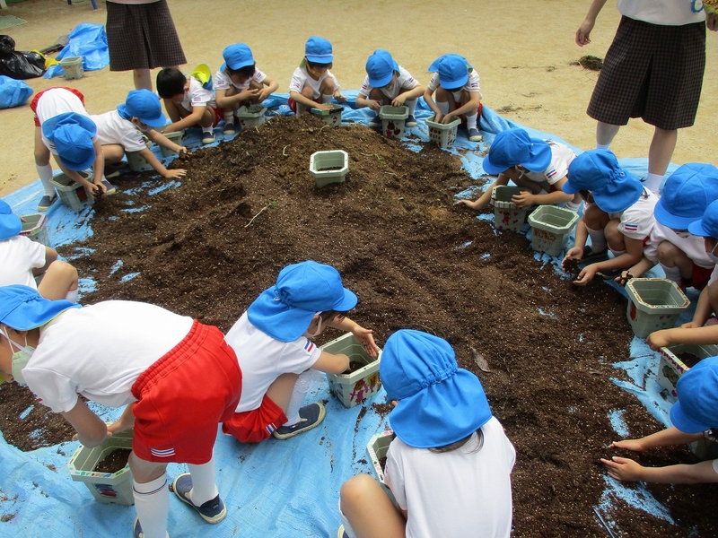 年長組がアサガオの種を植えました。 自分の植木鉢に絵を描いて、土や肥料をい……