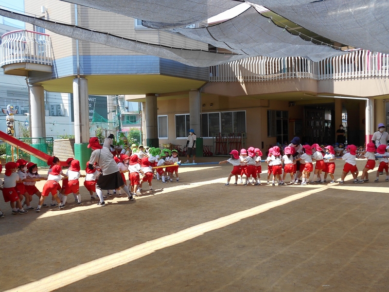 園庭で行われる園児だけの小運動会。各学年色々な種目に挑戦しました。 年中組……