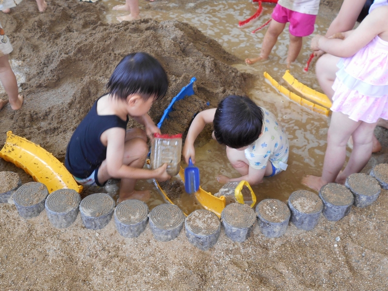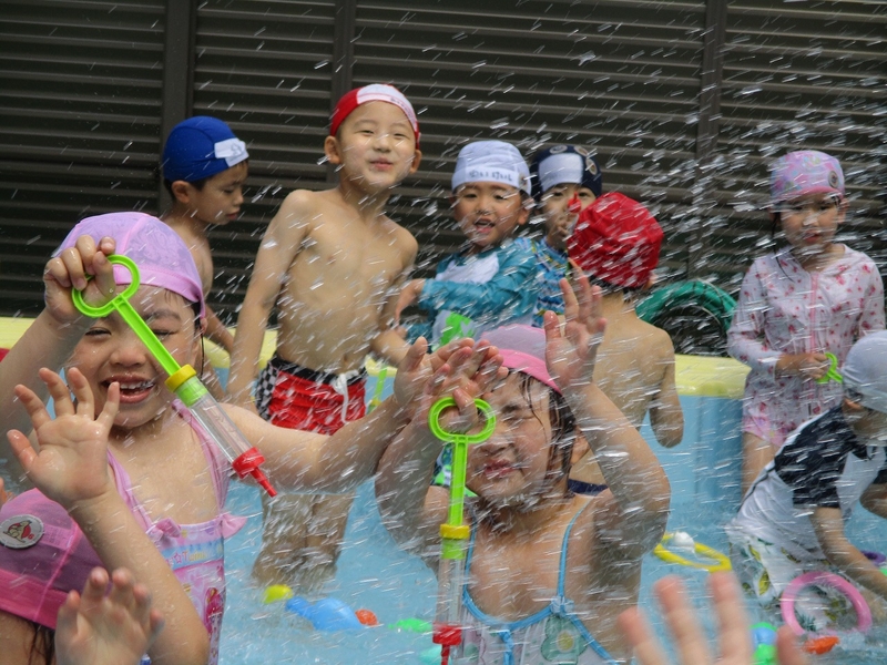 幼稚園でのプールは、スイミングと違い安心できる深さで、先生や友だちと一緒にゲーム……