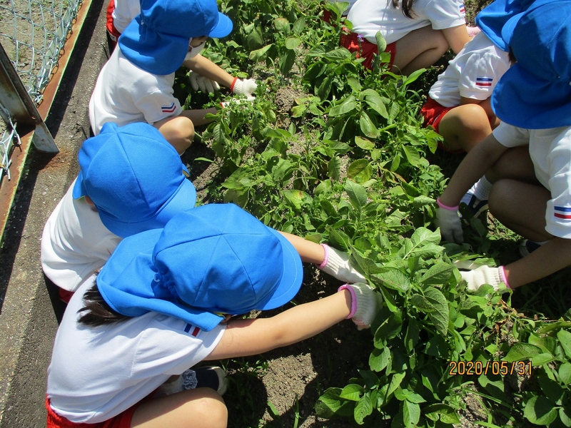 幼稚園の畑で育ったジャガイモを掘りました。手で掘ったりツルを引っ張り上げたりしな……
