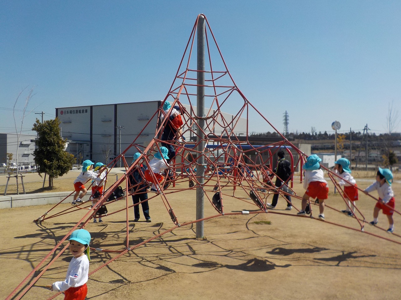 さくらんぼ組(満3歳児)が、彩都はなだ公園へお別れ遠足へ出かけました。 青……