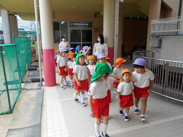 新しく年少を迎えて、歓迎の対面式を行いました。 年長組が年少組の部屋へ行き……