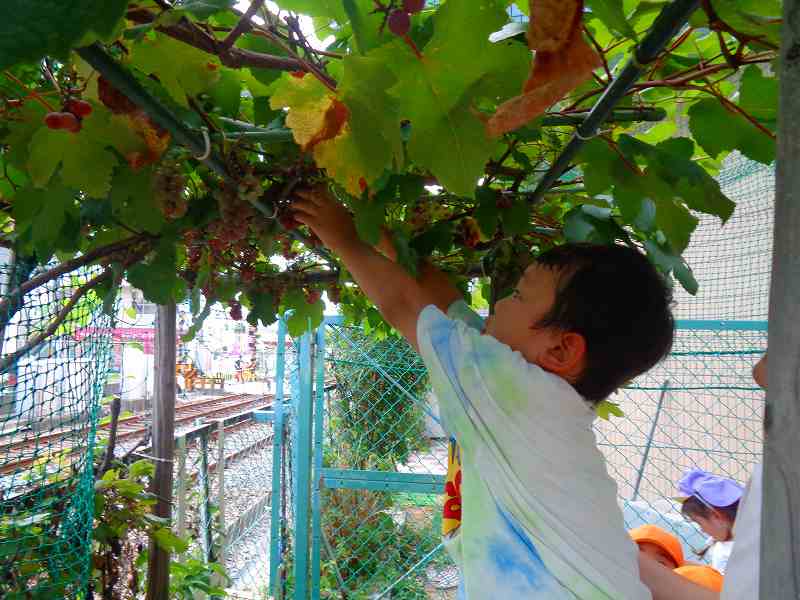 園庭のブドウの木に美味しそうに色づいた実がなりました。 預かり保育に参加し……