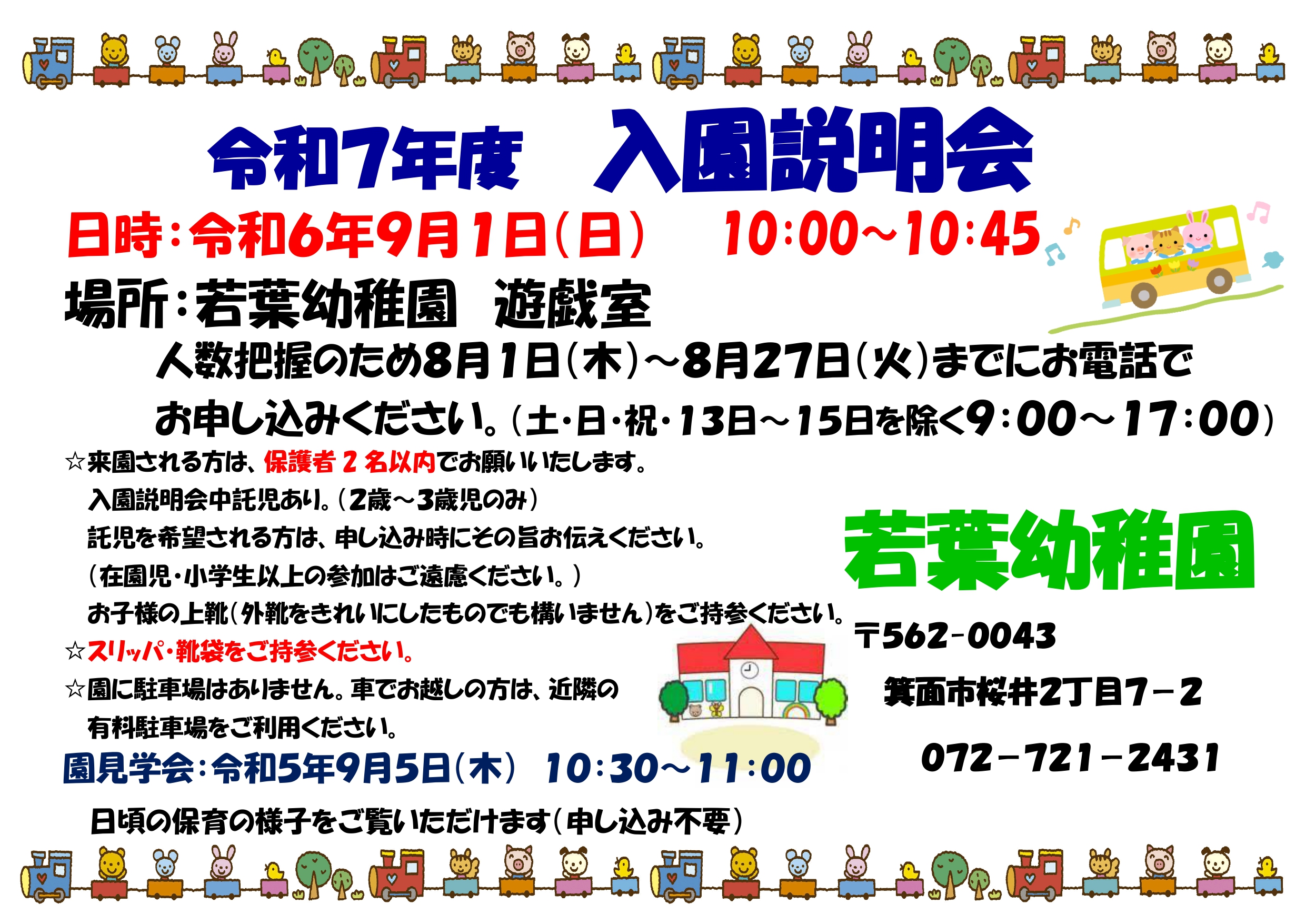 <入園説明会> 日時:9月1日(日) 予約制 場所:若葉幼稚園 遊戯……