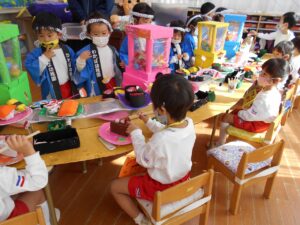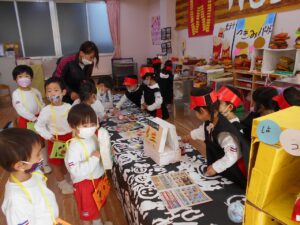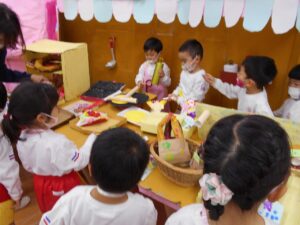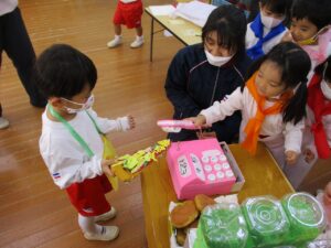 年少組は作った作品を使い、店員さん役とお客さん役に分かれて交代しながらお店屋さんごっこを楽しみました。