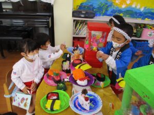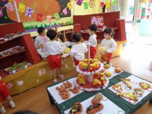 年少組は作った作品を使い、店員さん役とお客さん役に分かれて交代しながらお店屋さんごっこを楽しみました。