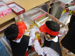 店員さんの衣装に身を包み、「いらっしゃいませ!」「こちらへどうぞ!」「ありがとうございました!」と大張り切り。言葉のやり取りも学ぶことができ、最高のごっこ遊びとなりました。
