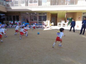 年長組以外の子どもたちも外遊びの時にボールを追いかける姿が増え、寒さに負けず、元気いっぱい体をうごかして遊んでいます。