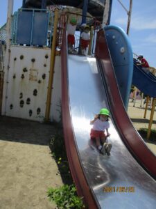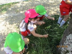 広い公園の遊具で存分に遊び、木陰でお弁当を食べた後は、広場でシロツメ草やどんぐりを集めたり、ゲームをしたり、元気いっぱい遊びました。