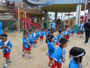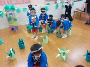園庭では、はっぴにハチマキを身につけて、げんきいっぱい盆踊りを踊って、お祭りを満喫しました。
