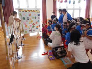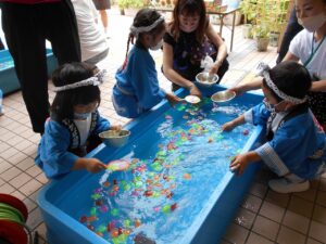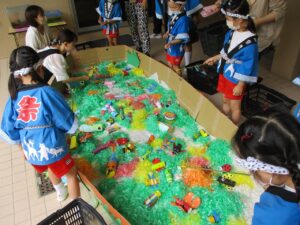 みんなが楽しみにしていた夏まつり。今年も園児だけの夏まつりとなりましたが、役員や委員のお母さま方が楽しいゲームや景品を用意してくださって、子どもたち大喜びで友だちと一緒に楽しみました。