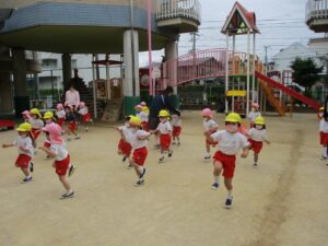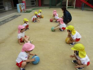 先生の話しをよ~く聞いて、順に走ったりケンケン、ジャンプ等元気いっぱい動いた後は、お友だちとペアになってボール遊びをしました。まずは、転がしてみよう!卒園までにいろんなボール遊びをして、ボールコントロールを養っていきます。