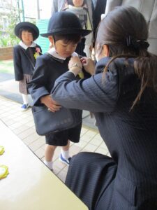大きめの制服を着た可愛い新入園児が、保護者の方に連れられ登園し、入園式が行われました。