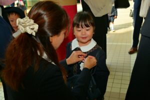 大きめの制服を着て、ワクワクドキドキ!お父さんお母さんと一緒に初登園。