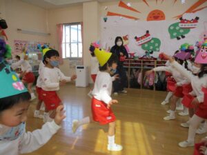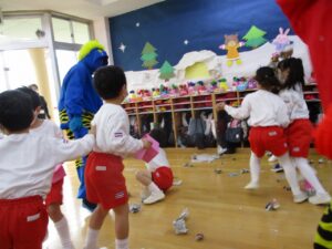 今年も各クラスでの節分の集いとなりました。近くで鬼が出没したとの放送を聞き、子どもたちは見つからないようにと息を潜めます。そして鬼が現れると保育室中大慌て!逃げ回ったり、先生の後ろに隠れたり、豆を投げて立ち向かっていったり…