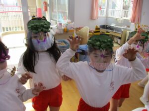 鬼が逃げ去った後は、自分たちで作った鬼のお面をかぶり、豆まきを楽しみました。
