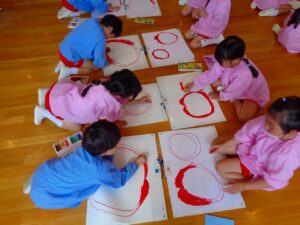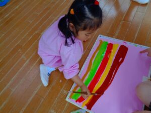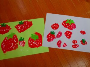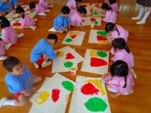 初めて使う絵の具!丸々描いたり、長~く線を描いたり、絵の具遊びの後はイチゴやハンバーグに変身!