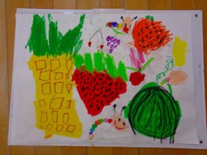 丸・三角・四角でどんな食べ物が描けるかな?それぞれイメージを膨らませながら描きました。