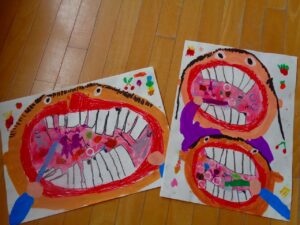 あ~んと大きく口を開けて鏡をのぞき込み歯の形や数に興味津々!よく観察しながら描きました。