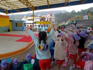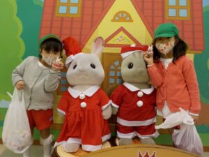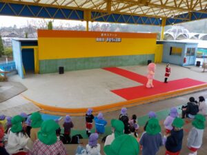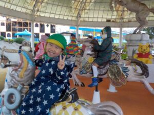 乗り物に乗ったりパビリオンで遊んだり、お弁当の後にはキャラクターのショーがあって一緒に踊ったり、雨なんて物ともせず、存分に楽しみました。