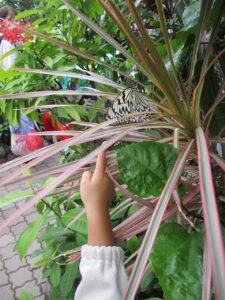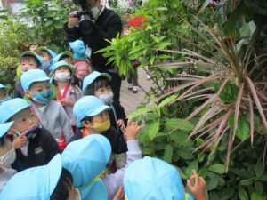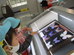 大きなハチやカブトムシの模型に大興奮の子ども達。ちょうちょうのいる温室では「ちょうちょういた~」「こっちにもいる~」とおおはしゃぎでした。