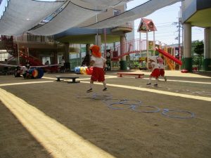 年少組は障害物競争。グーパッと跳んだら、次はバランスをとりながら平均台をわたり、トンネルをくぐってゴール!