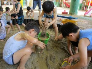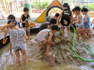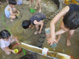 泥の感触を楽しんだり、泥団子を作ったり、また、大きな砂山や樋に水を流したりして、試したり工夫したり全身泥だらけになりながら存分に遊ぶことができました。