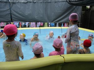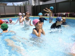 幼稚園でのプールは、スイミングと違い安心できる深さで、先生や友だちと一緒にゲームをしたりおもちゃを使って思いっきり水遊びを楽しみ、水に親しんでいます。