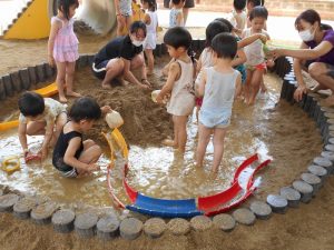 砂場で山を作ったり、川を作って水を流したり、おもちゃや道具を使って思いっきり遊びます。