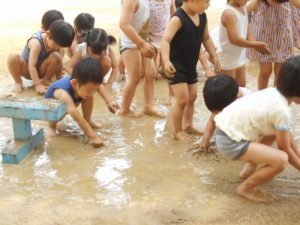 砂場だけではなく、園庭のぬかるんだ所では、ぬるぬるの感触を楽しんだり、絵を描いたりして楽しんでいました。