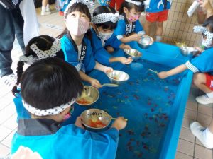 今年も夕涼み会ができなかったので、役員・委員のお母さんが、園児と先生の❛子ども夏まつり❜を開いてくださいました。