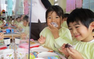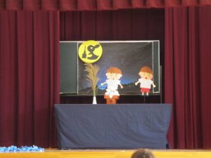今日は十五夜、幼稚園でもお月見会が開かれました。各学年ごとに遊戯室へ集まり、先生方によるお月見シアター“おつきみうさぎ”を観て、園長先生から月の模様やお月見についてのお話しを聞きました。
